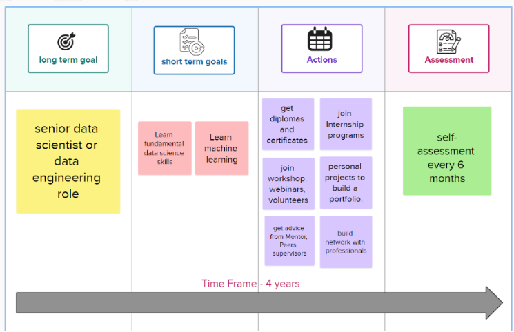 “မေဖြိုးက software engineer တစ်ယောက်အဖြစ်လုပ်ကိုင်နေတာ ၂ နှစ်ရှိပြီ။ မေဖြိုးက သူမရဲ့ career ကို data science role အနေနဲ့ ကူးပြောင်းချင်တယ်။ ဒါကြောင့် မေဖြိုးက career map တစ်ခုကို ခုလို တည်ဆောက်ခဲ့တယ်။”