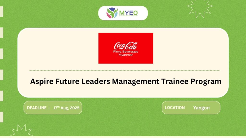 Coca-Cola Pinya Beverages Myanmar မှ Fresh Graduate တွေအတွက် Commercial, Finance, People, Supply Chain, IT စတဲ့ နယ်ပယ်တွေမှာအလုပ်လုပ်ရင်း ခေါင်းဆောင်မှုစွမ်းရည်နဲ့ တခြားသော Professional Skill တွေကို မြှင့်တင်ပေးဖို့ ရည်ရွယ်ပြီး ပြုလုပ်တဲ့အစီအစဉ်တစ်ခုဖြစ်ပါတယ်
