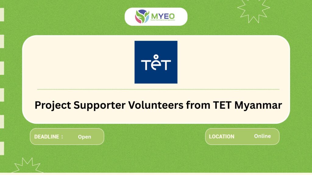 Paid Volunteer Position တစ်ခုကို TET Myanmar ကနေ ခေါ်ယူနေပါတယ်နော်။ Online ကနေပဲ တပတ်ကို ၅ – ၆ နာရီပဲလုပ်ပေးရမှာဖြစ်ပြီး allowance ကောင်းကောင်းလည်းပေးထားတာတွေ့ရပါတယ်။ အပြိုင်အဆိုင်အများကြီးနဲ့လျှောက်ရမယ့် နေရာတခုဖြစ်လို့ သေချာလေးနဲ့မြန်မြန်လေးပြင်ဆင်ပြီးလျှောက်ထားကြနော်။