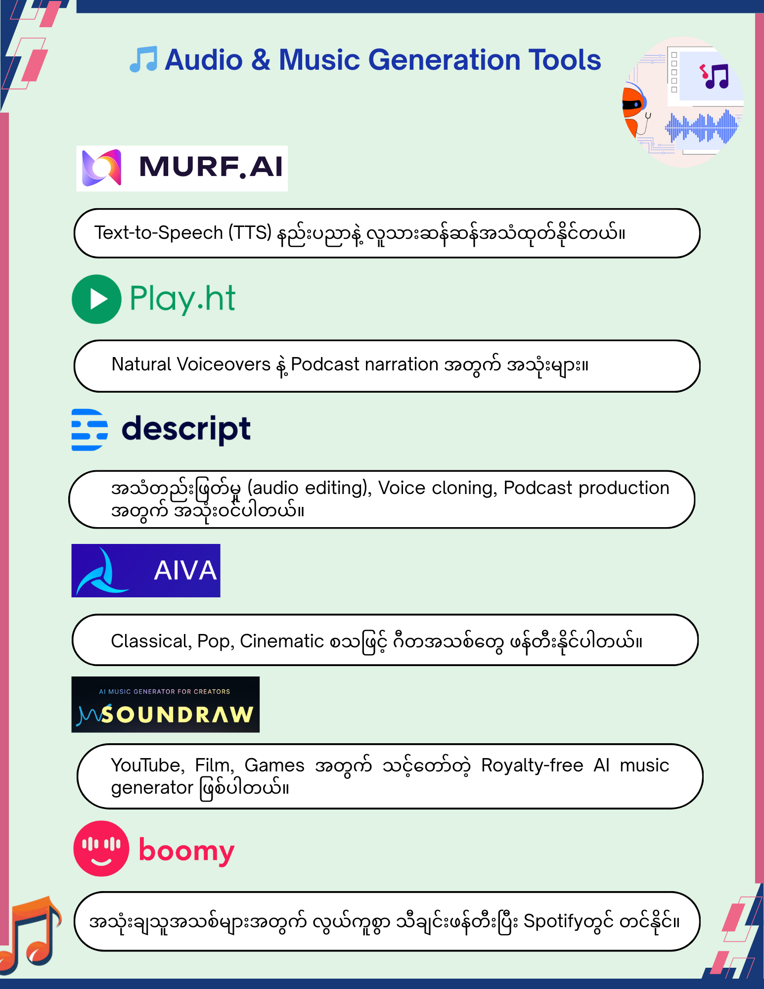 Generative AI က ဂီတ နဲ့ အသံနယ်ပယ်မှာလည်း အောက်ပါအတိုင်း အသုံးဝင်ပါတယ်။