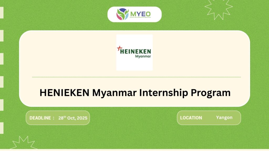 အထက်တန်းအောင်မြင်ပြီးသူတိုင်း လုပ်ငန်းအတွေ့အကြုံမရှိသူများလည်းလျှောက်ထားလို့ရမယ့် Henieken Myanmar ရဲ့ internship program ဖြစ်ပါတယ်။ ၁၂လတာကြာမြင့်မယ့် Program လည်းဖြစ်ပြီး လစာလည်းရမှာဖြစ်သလို အတွေ့အကြုံနဲ့သင်ကြားမှုတွေကိုလည်းရဦးမှာဖြစ်ပါတယ်နော်။ မြန်မာနိုင်ငံမှာရှိနေတဲ့သူဖြစ်ပြီး in person လုပ်နိုင်ရမယ့်သူလည်းဖြစ်ရမှာပါ။ Collaboration လုပ်တာမဟုတ်ဘဲ အခွင့်အလမ်းကိုသီးသန့်ဝေမျှပေးတာဖြစ်တာကြောင့် MYEOers လေးတို့မေးသမျှကို ပြန်လည်ဖြေကြားနိုင်မှာမဟုတ်တဲ့အတွက် ကြိုပြီးတောင်းပန်အပ်ပါတယ်နော်။ register link နဲ့ အသေးစိတ်ကိုတော့ အောက်က webiste မှာဝင်ဖတ်ပေးပါနော်။