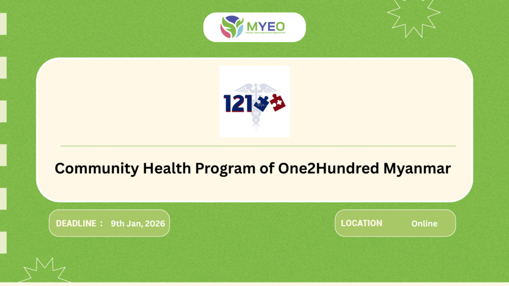 MYEO မှ One2Hundred Myanmar ရဲ့ Community Health Program အတွက် media partner အဖြစ် ပါဝင်ပံ့ပိုးပေးထားကြောင်း အသိပေးရင်း လူငယ်တွေအတွက် အကျိုးရှိစေမယ့် One2Hundred အကြောင်း တစေ့တစောင်း ဝေမျှပေးလိုက်ရပါတယ်။
